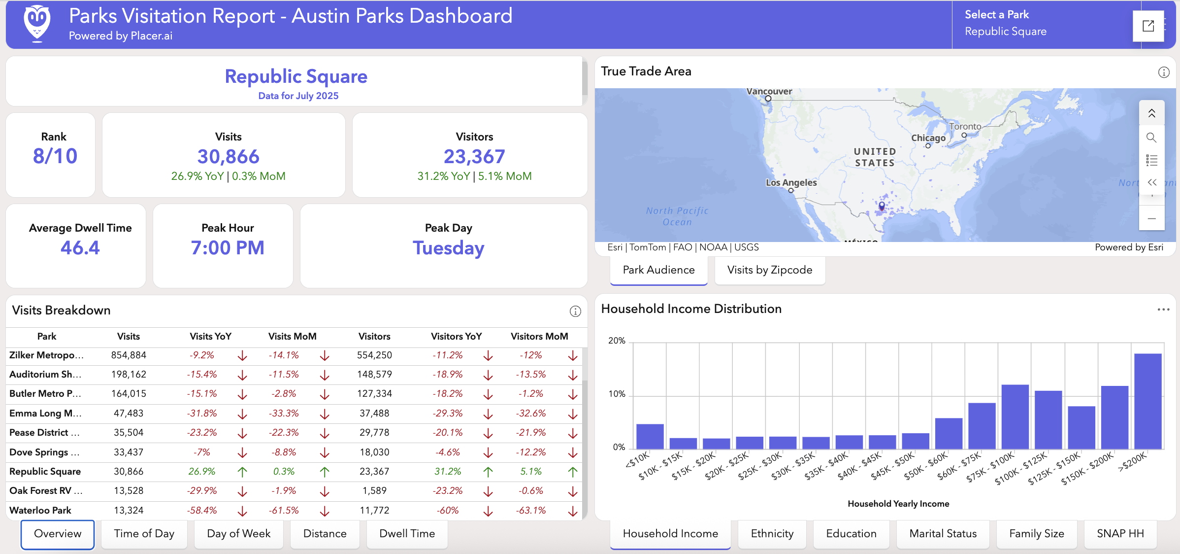 Measure impact, improve access, and strengthen community outcomes with a seamless integration of Placer location data into your Esri ecosystem - with the Parks and Recreation Dashboard
